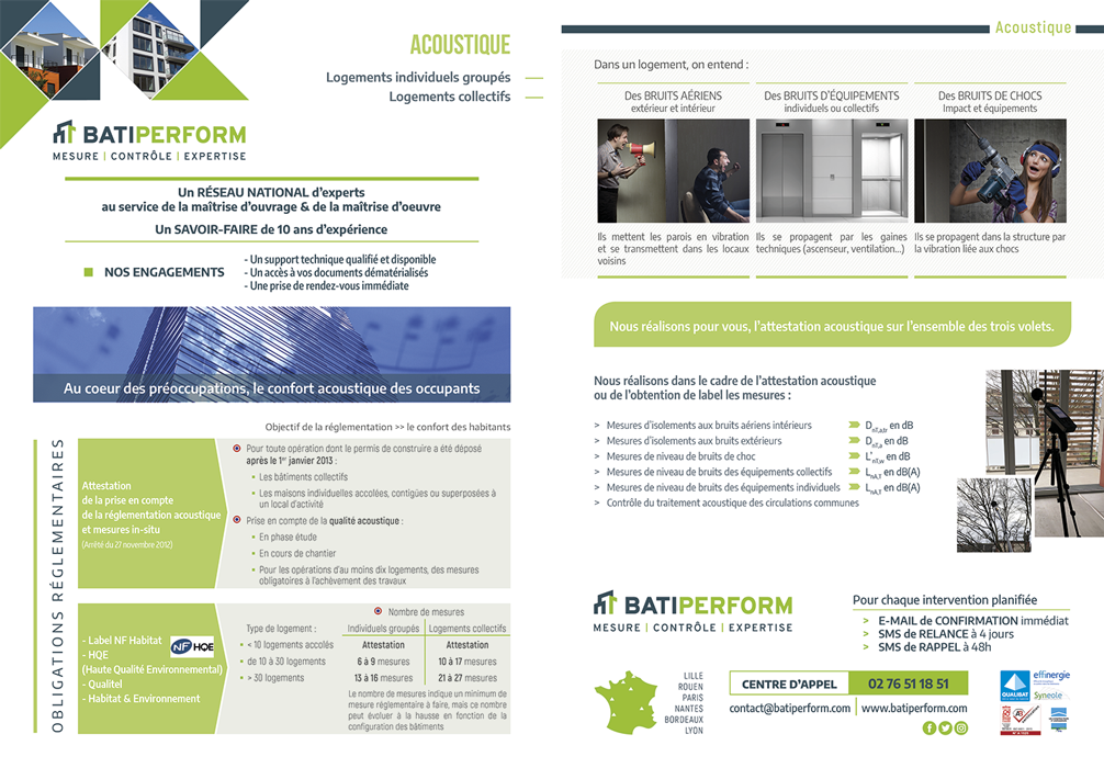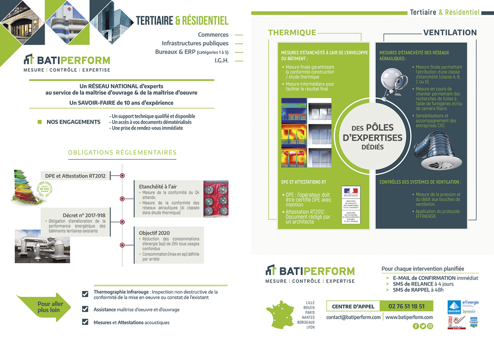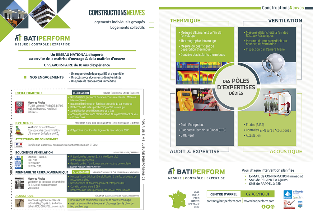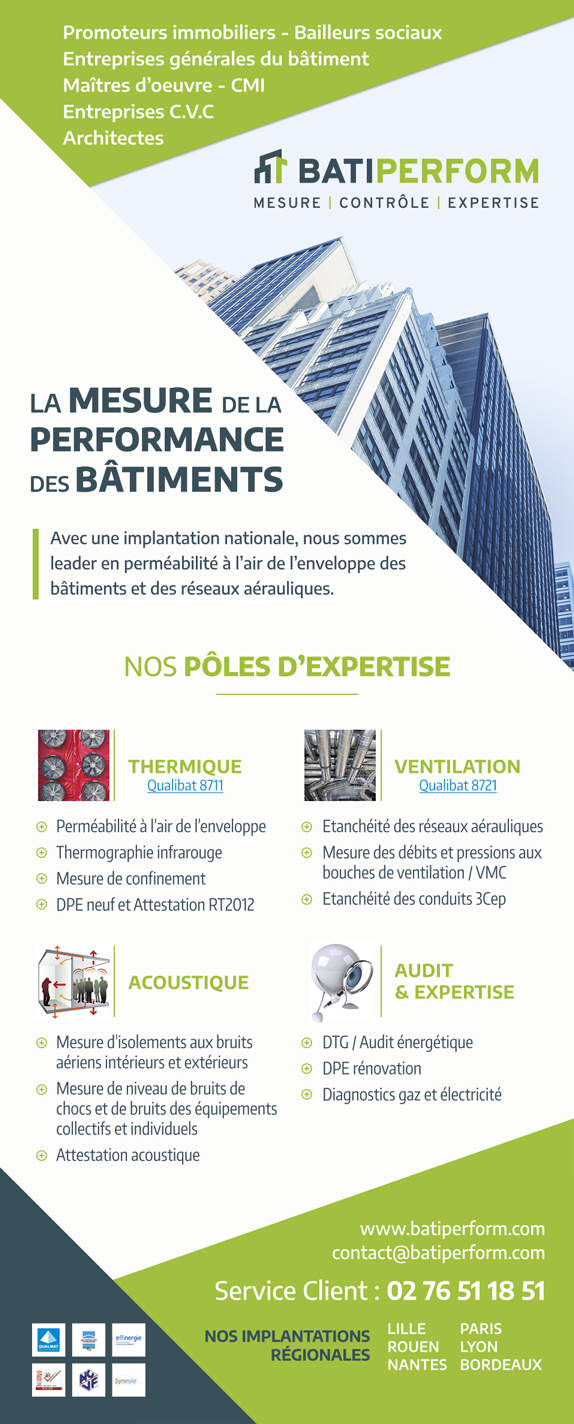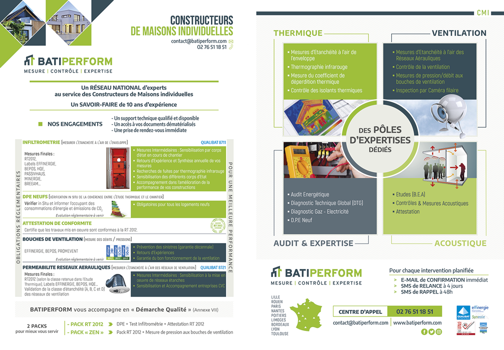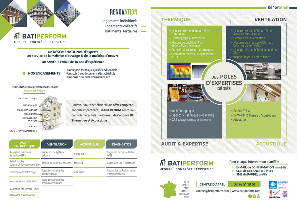 Batiperform (anciennement Diagtherm) intervient dans le contrôle et mesure de la performance des bâtiments : étanchéité à l’air, acoustique, ventilation et performance énergétique. Cette entreprise accompagne les professionnels du bâtiment dans la conformité réglementaire et la qualité des constructions neuves ou rénovées.